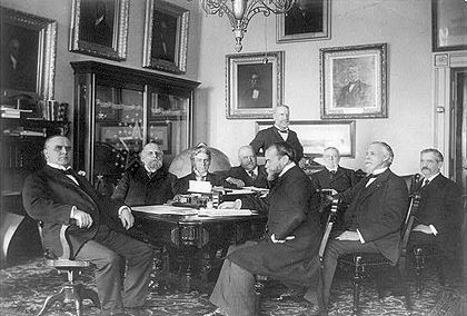 At far left: William McKinley. Left to right in back of table: Lyman J. Gage, John W. Griggs, John D. Long, James Wilson standing, and Cornelius N. Bliss. Left to right in front of table: John Hay, Russell A. Alger, and Charles E. Smith