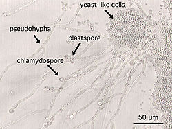 Yeasts of the Candida genus are another group of opportunistic pathogens which causes oral and vaginal infections in humans, known as candidiasis. Candida is commonly found as a commensal yeast in the mucus membranes of humans and other warm-blooded animals. However, sometimes these same strains can become pathogenic. Here the yeast cells sprout a hyphal outgrowth, which locally penetrates the mucosal membrane, causing irritation and shedding of the tissues. The pathogenic yeasts of candidiasis in probable descending order of virulence for humans are: C. albicans, C. tropicalis, C. stellatoidea, C. glabrata, C. krusei, C. parapsilosis, C. guilliermondii, C. viswanathii, C. lusitaniae and Rhodotorula mucilaginosa. Candida glabrata is the second most common Candida pathogen after C. albicans, causing infections of the urogenital tract, and of the bloodstream ( candidemia).