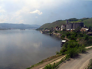 The Angara River (Ангара́) river drains Lake Baikal and runs 1840 km from the regional capital Irkutsk to converge with the Yenisei at Strelka ( 58.101° N 92.998° E). It is dammed in four places to power local industry. The 44m dam at Irkutsk produces 650 MW. Bratsk lies 500 km downstream, where the 124 m dam built in the 1960s produces 4500 MW. The resultant reservoir is nicknamed Dragon Lake because of its outline. The tributary Oka and Iya rivers, which rise on the north slopes of the Eastern Sayan Mountains, form the 'jaws' and 400 km of the Angara form the 'tail'. There are newer dams almost as large at Ust-Ilimsk 250 km downstream (also damming the tributary Ilim river) and Boguchany a further 400 km downstream (not operational). Further dams are planned but the environmental consequences of completely taming the Angara are leading to protests which may prevent funding.