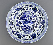 A Yuan Dynasty blue-and-white porcelain dish with fish and flowing water design, mid fourteenth century, Freer Gallery of Art.