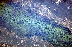 Eighty kilometres (50 mi) further down, the Luanginga, which with its tributaries drains a large area to the west, joins the Zambezi. A few kilometres higher up on the east the main stream is joined in the rainy season by overflow of the Luampa/ Luena system.